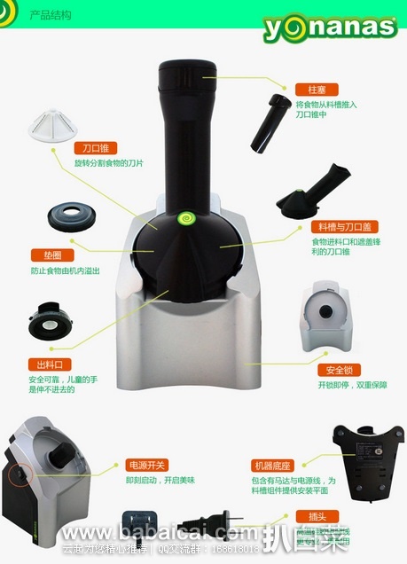 Yonanas 都乐家用水果冰激凌机,工作原理其实很简单,内有四组刀片,可把冰冻过后的水果打成果泥,需注意的是不管做什么口味的冰淇淋,都最好是放一些香蕉(Banana)进去做粘合剂,估计也是这货为毛叫Yonanas的原因,爱吃冰淇淋可以考虑,自制水果冰淇淋,美味又健康。
