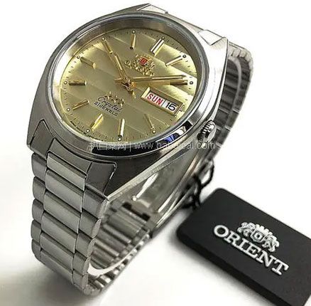 这款Orient 东方双狮 ThreeStar 男士机械表 FAB00006C9,采用机械机芯,浅金色圆形表盘,3点处显示星期和日期,表盘直径37mm,厚10.5mm,30米生活防水。