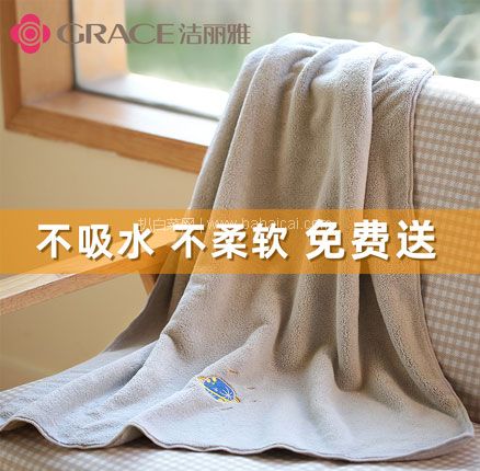 洁丽雅 家用SMM级强吸水珊瑚绒速干浴巾,采用SMM级强吸水珊瑚绒织造,丝线细腻,手感柔滑,饱满绒毛,掉毛率低;特殊的捻线技术使浴巾遇到水之后能像天然海绵一样迅速将水吸入;限定刺绣款式,独特又趣味的刺绣图案,萌趣可爱。