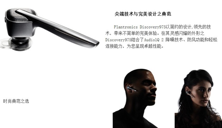 Plantronics Discovery 975 Bluetooth Headset - Retail Packaging - Graphite,缤特力Discover 975采用了最新的双麦克风AudioIQ技术,有效地保证了通话质量。同时该耳机采用蓝牙 v2.1EnhancedDataRate(EDR)版本,在10米内的范围内都能提供良好的支持。还同时拥有了连接两个蓝牙设备的 “Multipoint”技术以及QuickPair技术,连接速度和兼容性都得到质的提高,更加方便与手机配对。