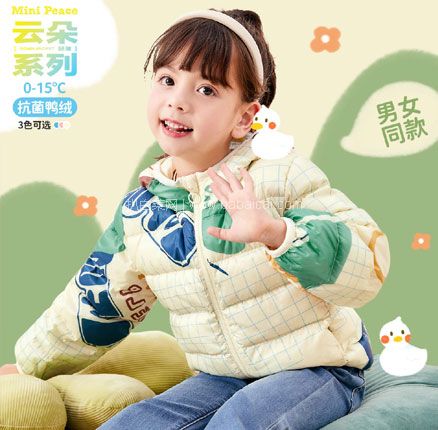 天猫商城minipeace旗舰店售价¥299,可使用¥150优惠券,实付¥149包邮,3色可选,太平鸟童装旗舰店出品,线下同款,90%含绒量,高温杀菌安全无异味,男女童同款,轻盈保暖高蓬松度。90~150码全。天猫商城购买地址>>