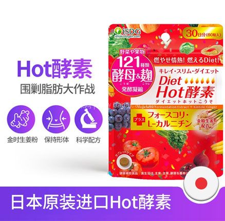 这款ISDG 医食同源 Diet Hot酵素 60粒,日本原装进口,含有植物发酵提取物粉末、人参生姜粉、彩叶茯苓提取物粉、谷物粉、面包酵母、结晶纤维素等,分解糖分,疏通肠胃,提高热量消耗,阻止脂肪吸收,去湿气寒气,暖身驱寒,保持形体。