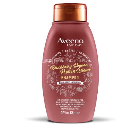 Aveeno Color Protect & Strengthen+ Blackberry & Quinoa Shampoo艾维诺 黑莓藜麦护色&强韧洗发水,规格354mL/瓶,含有燕麦蛋白、黑莓和藜麦蛋白,可舒缓头皮,强健发根,并帮助保持色彩并防止热定型,适合染发护色,具有淡淡果香。