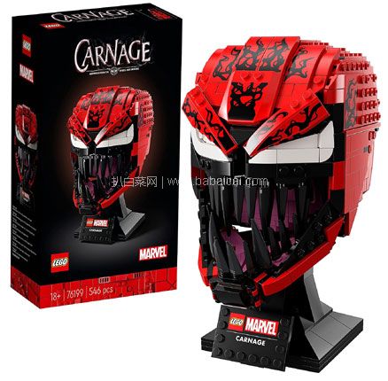 这款LEGO乐高 漫威蜘蛛侠 毒液76199 屠杀头盔 CARNAGE,套装包含546片颗粒,主题基于18岁成人收藏,部分五官采用了稀有的彩色元素,以及大量的非常规零件,整体来看不像一件“冰冷”的头盔,信息牌上刻有乐高和漫威标识。