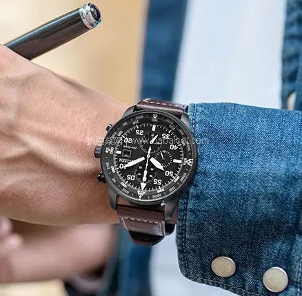 Citizen 西铁城 CA0695-17E 男士小牛皮光动能手表,采用不锈钢表壳及小牛皮表链,三眼计时设计,阿拉伯数字时标,表盘直径44mm,厚13mm,3点处带日期显示,矿物质材质玻璃。内部采用光动能机芯,吸收日常可见光作为能量来源,终身无需更换电池,100米防水。