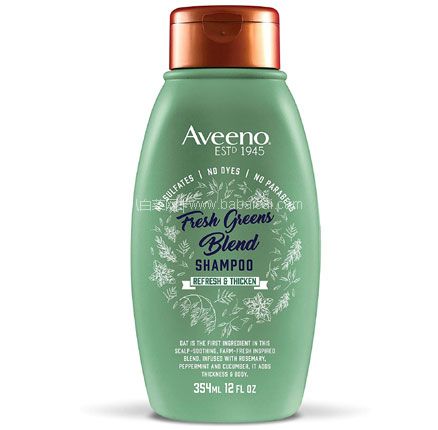 Aveeno Scalp Soothing Fresh Greens Blend Shampoo艾维诺 黑莓藜麦护色&强韧洗发水,规格354mL/瓶,含有迷迭香、薄荷和黄瓜,清爽控油,可舒缓头皮,强健发根,适合轻盈蓬松、细软发质。