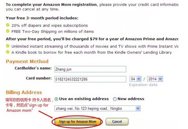 5、填写你的信用卡信息,包括持卡人姓名,卡号,有效期,然后点"Sign up for Amazonmom"。