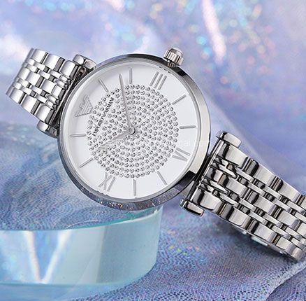 这款ARMANI阿玛尼石英女士手表AR1925,采用石英机芯,不锈钢表壳和珍珠贝母表盘,点缀炫目水钻,相当耀眼。不锈钢表带,好看耐磨。表径32mm,厚度8mm,30米生活防水。