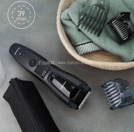 Panasonic ER-GB62 Wet and Dry Beard, Hair and Body Trimmer松下 剃须刀/理发器,可作为家用型理发器,也能作为剃须刀使用,还可以用于修剪体毛,内附3个专用修剪梳,提供39段修剪长度选择,修剪范围0.5-20mm,45°角的修剪刀片锋利无比,确保修剪准确一致,3段LED充电指示灯,有线或无绳操作选项,1小时快充,无线使用长达50分钟。全身水洗,干湿两用,不锈钢刀片,更加耐磨耐用。