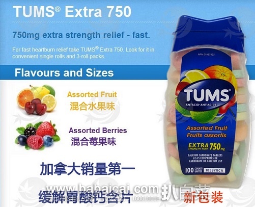 加拿大销量第一的缓解胃酸钙含片,防胃酸补钙双重功效,每一粒含有750毫克的钙,咀嚼水果口味,口感好。