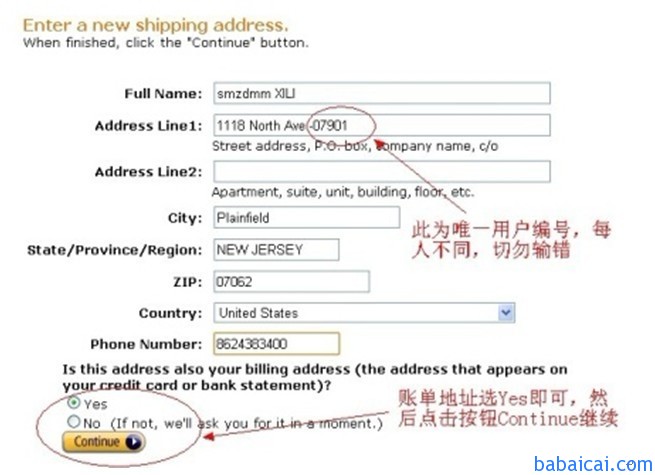 完全按照转运公司的地址填写哦,包括收件人姓名。账单地址选yes和转运相同也可,但是如果不怕麻烦最后这里选no,然后后面会提示你填写账单地址,届时如实填写国内实际账单地址,拼音填写即可。