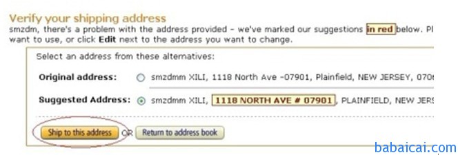 亚马逊会给一个建议地址,选择原地址或建议地址皆可,点击按钮Ship to this address继续