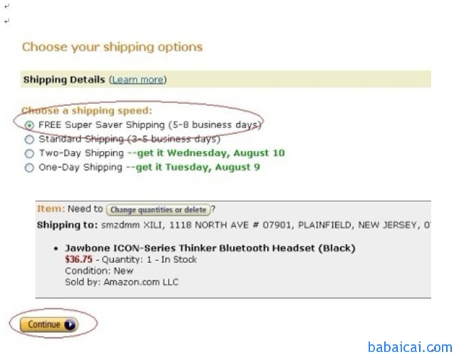 选择免费的5到8天快递后点击按钮Continue继续。如果你确认自己的Amazon Prime免费试用服务有效,可以选择”Two-Day Shipping”,两天就能寄到美国的转运地址了。