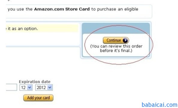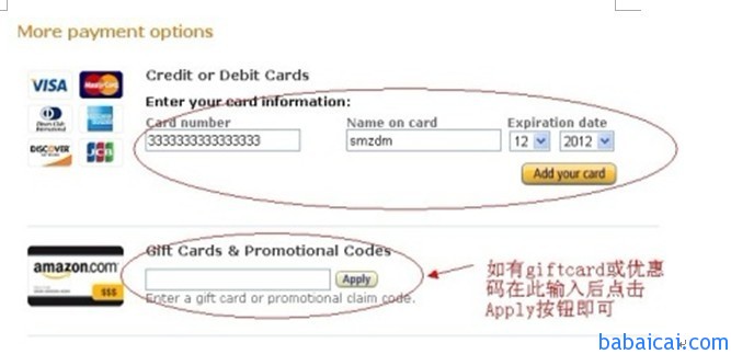 点击Add a new card输入信用卡卡号、持卡人姓名及有效期,如有gift card或优惠券码可在下面输入。这里必须注意:国内的双币信用卡在Amazon消费是不需要CVV码的,只需要卡号、姓名和有效期三样钱就划出去了。所 以要保证自己的信用卡安全,除了拿到手后记住并刮掉CVV码外,吃完饭结账不要图省事给服务生代刷,甚至不要将卡片轻易借予他人,这样才能降低被盗刷的风 险。