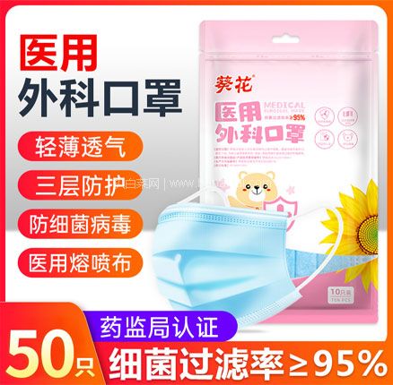 天猫商城:白菜!葵花药业 成人/儿童一次性医用外科口罩50只 低至¥6.9元包邮 居家必备!另有独立包装券后¥9.9包邮