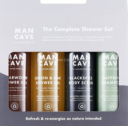 ManCave 男士护肤三件套装包含:雪松沐浴露500mL+柠檬橡木沐浴露500mL+咖啡因洗发水500mL+黑香料身体磨砂膏500mL。英国《GQ》、纽约《Esquire》君子等时尚杂志热荐!ManCave是为数不多的承诺纯天然的男士护肤品牌,性价比超高。ManCave坚持用天然原料取代人工化学品,对于一些不寻常的成分会通过一个A-Z的成分表对消费者进行公开透明,所以在公信度上也是十分可靠的。