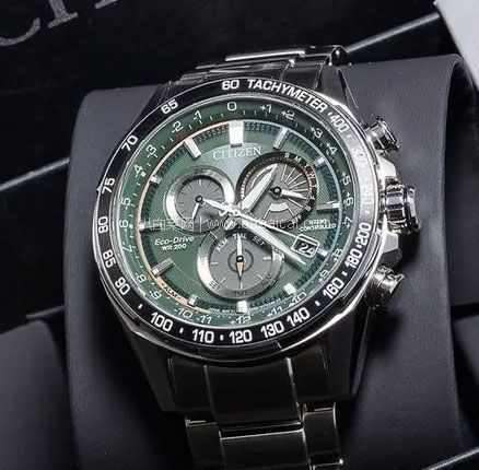 Citizen 西铁城 CB5914-89X 男士三眼计时光动能五局电波手表,属于Promaster Pilot系列,采用单面防眩光蓝宝石玻璃镜片,不锈钢间GIP表壳及表链,搭载E660光动能机芯,任何可见光源的存在就能为其充电,满电后在无光环境也可提供180天的精准走时,提供24个时区时间显示,可接收5局电波(中国、美国、欧洲、日本-西东)并自动校正时间。绿色三眼计时表盘,表盘宽度43mm,厚度13mm,外圈为双向旋转方位圈,内有24小时指示盘、60分钟计时、模式指针盘等3个小表盘,4点钟位置显示日期,支持200米防水。