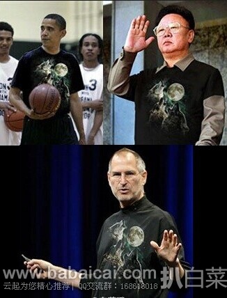 这要源于购买这件T恤的第一位顾客所给出的5星评论,大概意思就是:这件T恤纯棉本身就值5星,还能盖住我的小肚腩,之后我穿着去了沃尔玛,突然就 有女生过来搭讪了,觉得我的T恤很好看,像个独行侠,偶尔还会对着月亮嚎叫两声,问能不能做我的女盆友,我立马说No,因为狼可没这么容易被勾搭上!由于 这条评论,之后便一发不可收拾,各类搞笑评论都来了,什么穿上以后战斗力爆棚,战斗系数X3等等。网红自然就会被各种恶搞,也就有了下面乔帮主,奥哥,金 三胖他爹被P的各种图片,以及各种耍宝照片出炉。