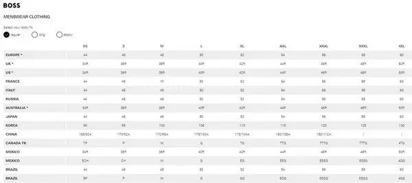 HUGO BOSS官网尺码表如下,找对应欧码即可:
