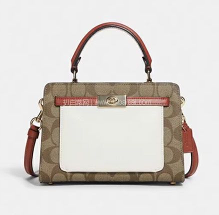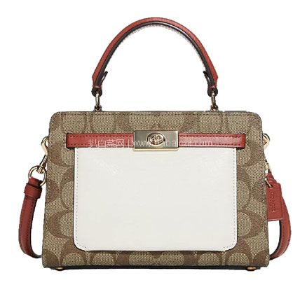 COACH Women's Mini Lane Top Handle in Signature Canvas蔻驰 女士拼色经典斜挎包,采用人造革配牛皮革配剖层牛皮革,内置拉链和多功能袋,搭扣开合,织布衬里外置开放式口袋,垂直长度7.5cm,手柄垂直长度57.5cm,可拆卸肩带,用于肩背或斜挎,4个底部保护脚,尺寸20*14*8.5cm。