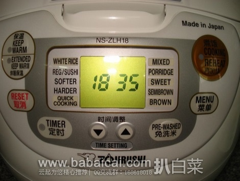 这款Zojirushi NS-ZCC18 10-Cup (Uncooked) Neuro Fuzzy Rice Cooker and Warmer, Premium White, 1.8-Liters象印微电脑黑金刚多功能电饭煲搭载智能微电脑控制系统,采用了先进的神经模糊逻辑技术,准确控制温度和时间,以达到最佳烹饪的效果。超大型彩色液晶显示屏,清晰显示时钟与定时设置。可拆卸内盖,方便清洗。具有自动保温及再加热功能。特殊材质的厚黑金刚内锅,使得米饭在烹煮过程中受热更加均匀。功能多样,可以做白米饭、什锦饭、粥、糯米饭、半糙米饭、糙米饭、免淘洗米及快速煮饭。配置2个量杯、1个不粘锅的饭匙、1个饭勺夹和一本食谱。还有免淘洗米专用菜单,电源线可拆卸。