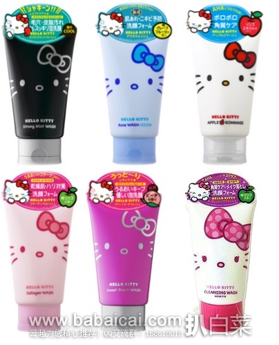 下面介绍的六款Hello Kitty的洁面产品同样是日本药妆店里的人气产品,白色管是去角质凝胶,苹果香型很好闻,洁面后擦干,涂抹面部按摩片刻就可以感觉到陈旧角质剥落,几分钟后洗掉就可以了,价格只要RMB21元,可以一试。白管枚红色图案的是经典款洗面奶。枚红色、粉色和蓝色同样是Rosette家族中很受欢迎的单品,分别是蜜桃味洗面奶,针对干燥肌肤的保湿型洗面奶和针对痘痘肌的去痘洗面奶。黑色则是清洁力最强的清凉薄荷型。以上所有款可爱好用的洗面奶售价都在RMB20元出头一点,既有可爱的Kitty,又有Rosette品质信赖。