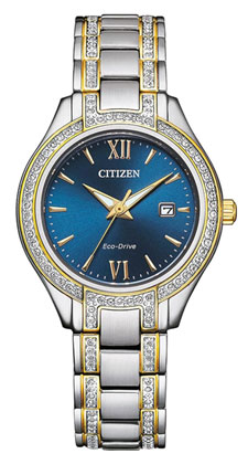 表壳和表链上镶嵌14颗水晶, CITIZEN女士剪影水晶无论走到哪里都会闪耀。两色不锈钢表壳和表带饰有醒目的海军蓝色三指针表盘,打造独一无二的腕表,这是任何收藏品的必备品。而且您永远不必担心更更换电池,这款女士金表来用获得专利的ECO-DRIVE技术,由光可持续供电。无论是在会议室、外出办事,还是在家附近,这款手表始终是搭配各种风格的完美配饰。