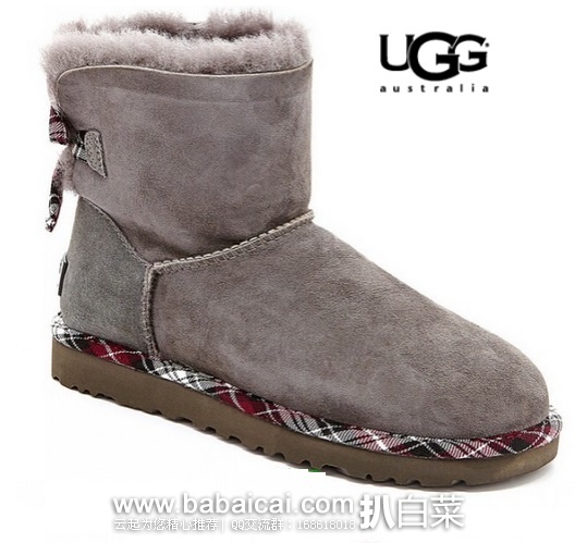 UGG Mini Bailey Bow Plaid短筒雪地靴,2014秋冬款,将经典的Bailey Button版型缩小,采用羊毛皮一体真皮材质,后跟和鞋底点缀格纹蝴蝶结,内部采用带毛羊皮衬里和鞋垫,温暖舒适,模压EVA外底,柔韧耐磨。利落的短靴不管是牛仔裤还是裙装,都可以百搭。