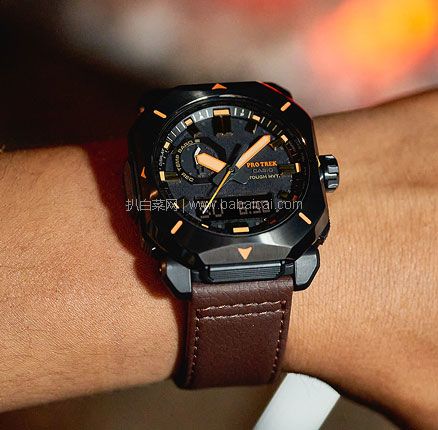 Casio 卡西欧 Field Survivor系列 PRW-6900YL-5 三重感应 太阳能电波表,是PRO TREK推出的全新Field Survivor系列表款,表圈的设计灵感来自于户外露营时用的工具,表盘里的指针形状如同户外使用的小刀,秒针的颜色取自于户外露营时的篝火。此外,此系列表款的咖啡色皮表带采用阻燃材质,适合户外时使用。