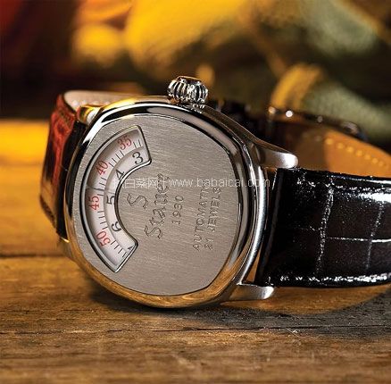 这款美国Stauer 男士自动机械腕表,货号17469,属于1930 Dashtronic系列 ,秉承"机械艺术"的美学理念,采用跳跃显示的独特复古外观设计,不锈钢拉丝表壳,仪表盘式表盘,矿物玻璃表镜,自动机械机芯,21石修饰,表盘直径39mm,厚度12mm,背透式设计,可窥机芯之美,黑色鳄鱼纹真皮表带,防水30米。
