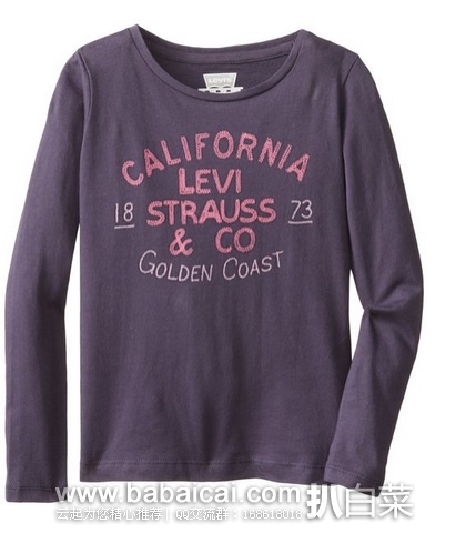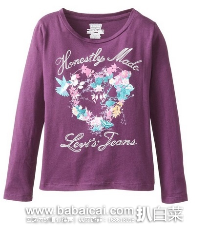 2、Levi's Little Girls' Honestly Made Beauty Tee,女孩紫色蝶恋花图案纯棉长袖T恤特价$6.44,4-6X尺码有货。