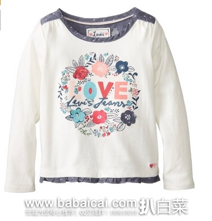 3、Levi's Little Girls' Janice Knit Top in Gardenia White,女孩绣花图案白色纯棉长袖T恤特价$8.4,2-4岁尺码有货。