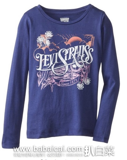 5、Levi's Little Girls' Rustic Strauss and Co Long-Sleeve Shirt 女孩海军蓝色纯棉长袖T恤特价$6.14,4-6X尺码有货