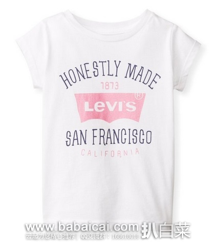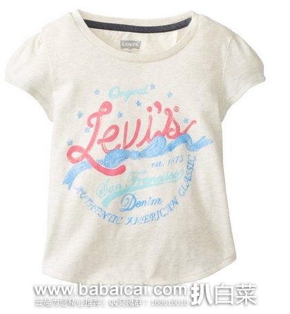 13、Levi's Little Girls' Honestly Made Tee 女孩白色logo图案纯棉短袖特价$6.73,2-3岁尺码有货