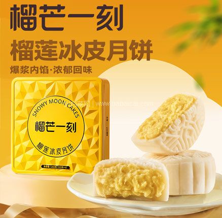 天猫商城榴芒一刻旗舰店480g礼盒装售价¥309.9,叠加¥260优惠券,券后实付¥49.9包邮,新低价,经典铁盒包装。120g/个的大月饼,新低价,用来当下午茶点心很不错!含60%内馅,连续6年的口碑好物,冰皮+泰国金枕头榴莲完美融合,冰糯软润,轻咬一口就拉丝,口感恰到好处!天猫商城购买地址>>