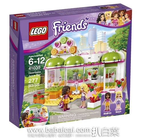 此款LEGO Friends 41035 Heartlake Juice Bar乐高 好朋友系列41035心湖果汁吧 由277颗粒组成。包括Andrea安德里亚和Naya娜雅迷你玩偶人物和果汁吧的设施。与Andrea?安德里亚一起去心湖城果汁吧 享受美味的果汁饮料。快决定想坐在哪里并查看有各种美味果汁饮料、沙冰和三明治的菜单卡,然后向柜台的娜雅点单。帮助娜雅使用美味的水果箱和混合机或榨汁 机制作饮料,然后给阳台上的安德里亚送去。她带着手袋,准备在心湖城度过愉快的一天。