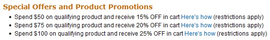 注意参与活动的产品图片下方Special Offers and Product Promotions一栏均有“Spend $50 on qualifying product and receive 15% OFF in cart...”等的字样。