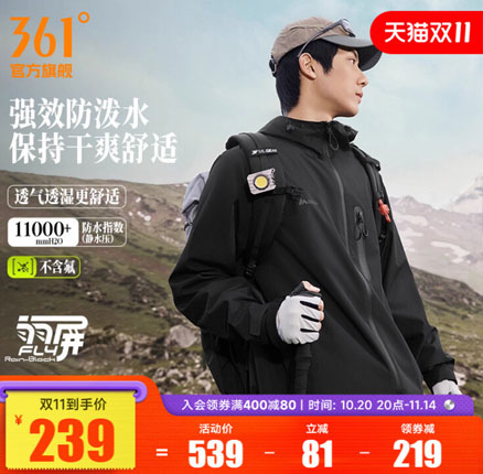 雨屏科技EX2.0,防水指数11000+mm·H2O,透湿率8000+g/(m²·24h)。目前天猫商城361度官方旗舰店售价¥539,官方立减15%,领取¥239优惠券,淘金币可抵扣¥31.17,88VIP会员领取无门槛9折消费券(可领2张,建议购买其他大额商品一起带回,以免浪费额度),叠加¥15首单礼金,实付¥154.05包邮,新低价,多色码全。天猫商城购买地址>>
