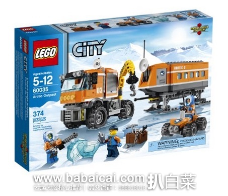 LEGO City Arctic Outpost 60035 Building Toy乐高 60035 城市系列 极地探险 北极探险工作站共有374颗粒数,包括3个小人仔、全地形车、极地起重机、高科技移动实验室,冰天雪地的感觉非常浓,附件和人偶设计完备。主题是讲述极地探险家克服极地艰难气候,寻找隐藏在冰层中的神秘物质,发现新线索,立即送入配有高新设备和显微镜的高科技试验站的故事。适合5岁以上的宝宝。