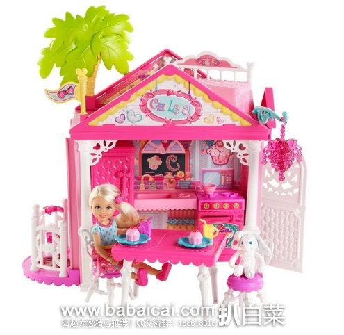这款Barbie Chelsea Doll and Clubhouse Playset 芭 比娃娃和芭比切尔西俱乐部玩具组合,目前特价仅$9.99,2014年新款,切尔西娃娃的俱乐部已经使芭比的后院成为她的朋友们的圣地!双层结构,双倍乐 趣;电梯供楼层之间使用。电梯适合切尔西的娃娃和她的宠物兔子同时乘坐。只要将它们放在露台上,抬起开关,她们就上去啦!二楼设有一个有趣的屋顶露台,切 尔西和她的朋友们可以在那里沐浴阳光,或凝视星星. 布置家具,供休息、睡觉或吃饭。可供选择的包括一个内置有粉色和白色桌椅的魅力餐厅、一个漂亮的粉白相间的沙发床。他们也在楼下活动,楼下有一个以蛋糕为 主题的厨房,是制作精致餐食或甜点的理想场所。柜台上准备食物,炉灶上烹饪美味,食物贮存在冰箱中,并在洗涤槽中进行清洁。可爱的配件包括餐具、杯形蛋糕 和带有吸管的杯子!