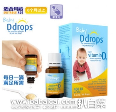 适合0-2岁的宝宝服用。这款Ddrops的婴儿维生素D3补充剂,特别为母乳喂养的宝宝设计,每一滴含有400IU的维生素D3。无人工香精、色素、防腐剂等成分,天然安全。