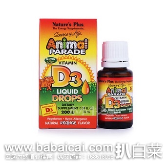 5、Nature's Plus 动物大巡游维生素D3 滴剂 橙味 (Nature's Plus Source of LifeAnimal Parade Vitamin D3 Liquid Drops,Natural Orange Flavor 200 IU 0.34 fl oz 10 ml