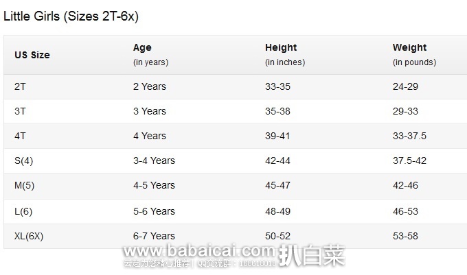 2-6岁女童尺码表,第三列是身高,乘以2.54换算成cm;第四列是体重(磅,乘以454再除以500可换算成斤)