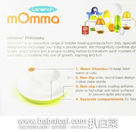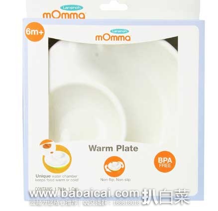 这款Lansinoh mOmma Mealtime Warm Plate, Green宝 宝分格保温餐盘,很实用的一个餐盘,直径约30厘米,适合6个月以上宝宝使用,材质安全不含BPA等有害物质,特色之处在于餐盘带有隔层,可加入热水给食 物保温,这样就不用担心宝宝总是吃冷饭了,而且夏天可以加入冷水快速冷却食物和保冷。宽大的底部设计防溢防滑,餐盘分为两块区域,可用于分开放置菜肴和米饭,软质材料,不易打翻。