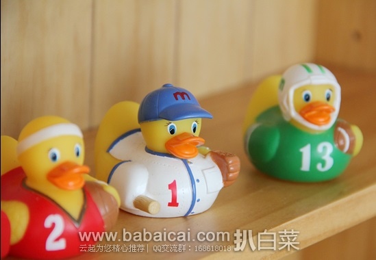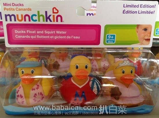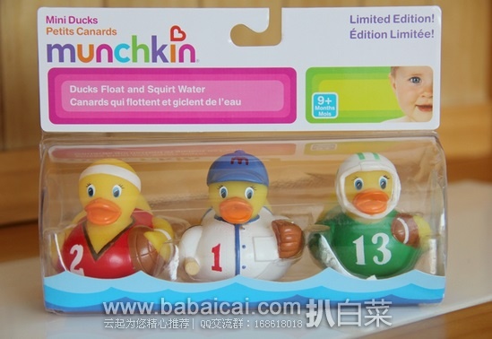 洗浴鸭子是美国每个家庭都拥有的宝宝洗浴玩具,Munchkin公司在可爱的形象之外,又作出新的设计,这款Munchkin, Mini Ducks , 9+ Months, 3 Pack,造型靓丽可爱,软软的鸭子,可以漂在水上,大小也适合宝宝手抓,可以按了以后吸水再射出去,非常好玩。在洗浴时与鸭子一同戏水,哪个宝宝不喜欢!麦肯齐游泳鸭子还有个特点哦,那就是这个可爱的鸭子不但能陪您的宝宝洗澡,还可以任其啃咬,是不错的牙胶哦。高环保的材质,非常安全。适合9个月以上的宝宝。