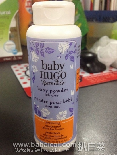 这款Hugo Naturals, Baby Powder, Unscented, 3 oz (85 g)宝宝爽身粉,不含滑石粉,无人工香料,无酒精,无石油附属品,可以在宝宝洗澡后和更换尿片时放心使用。只加入四种成分的调合:有机的牛油树脂,天然的玉米淀粉,营养品质的维生素E和纯的荷荷芭油,适合所有年龄的宝宝。