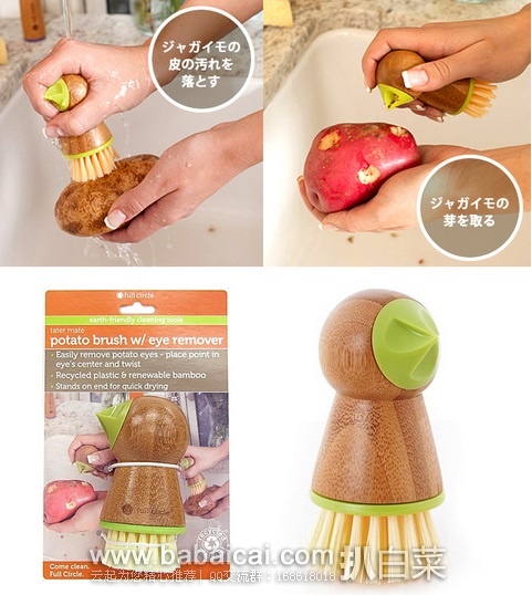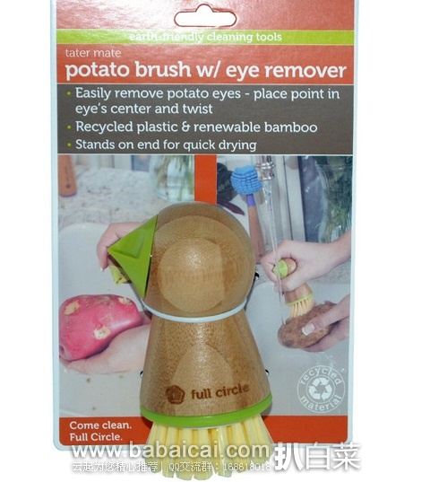 这个Full Circle Home LLC, Tater Mate, Potato Brush w/Eye Remover, 1 Brush苹果、土豆等刷洗/孔眼清除器,洗苹果和土豆以及去掉土豆上的孔眼等非常实用啊,是日常生活必须的神器,造型也很可爱,尖尖嘴就是用来扭掉土豆的豆眼的,非常贴心的设计,有些西餐中土豆是不去皮的,那这个刷子的功劳就更大了,不去皮,就直接用刷子多刷几次,把泥土等刷掉,有的人喜欢连皮吃水果的,同样用这个刷子刷刷刷,脏东西全部刷掉啦,怎么样,非常实用吧,材质是可再生的竹子和可再生的塑料,非常安全环保,刷子把打磨的圆圆的,拿着也很舒服。