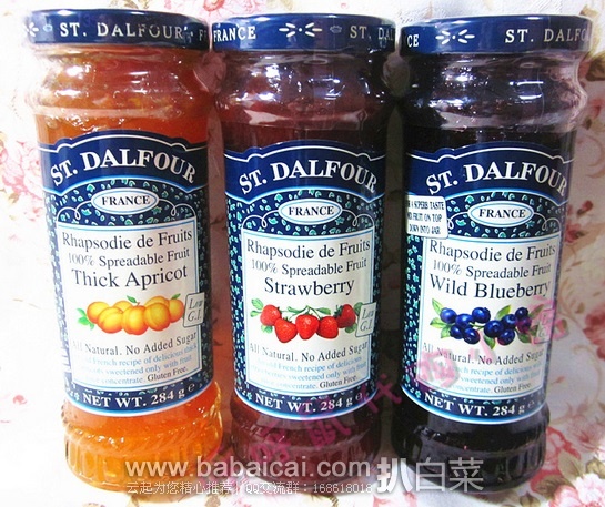 法国St. Dalfour圣桃园果酱用法国葡萄汁的浓缩精华代替普通蔗糖,因此更具果糖之天然风味,由于果糖甜味较蔗糖浓郁,放入少量即可,因此圣桃园果酱比之普通果酱含较低卡路里。此外圣桃园果酱不含任何味素,色素,添加剂和防腐剂可放心食用。圣桃园果酱有菠萝芒果酱、草莓酱、黑加仑果酱、黑山莓果酱、黑樱桃果酱、红山莓果酱、黄桃果酱、金桔果酱、蓝莓果酱、蔓越莓蓝莓果酱、什锦水果酱、杏子果酱等口味。