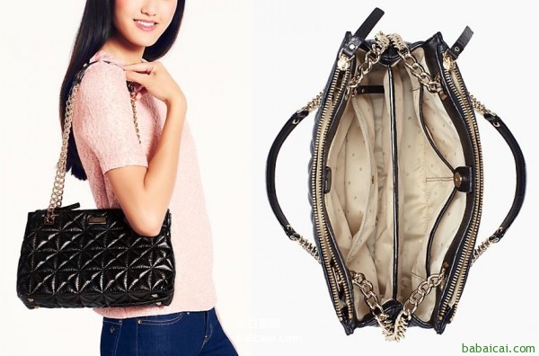之前同系列介绍过不少,这款是中号。kate spade new york Sedgwick Place Shoulder Bag凯特丝蓓真皮菱格单肩包,采用100%意大利软牛皮材质,表面亮漆,blingbling的很夺目。类似香包的菱格缝制方式,所有五金件均经过 14K镀金处理。吸铁搭扣封口,内部有两个带拉链安全口袋以及手机插袋等,包身尺寸约28*19*8cm,适合作为日常随身包。
