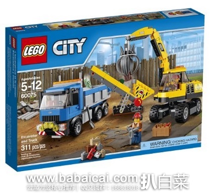 13、LEGO City Demolition Excavator and Truck LEGO 乐高 60075 城市系列 挖掘机和卡车(共311个颗粒)原价$50,现史低$39.99,直邮无税 到手¥288,国内¥449。适合5-12岁儿童玩耍。亚马逊购买地址>>